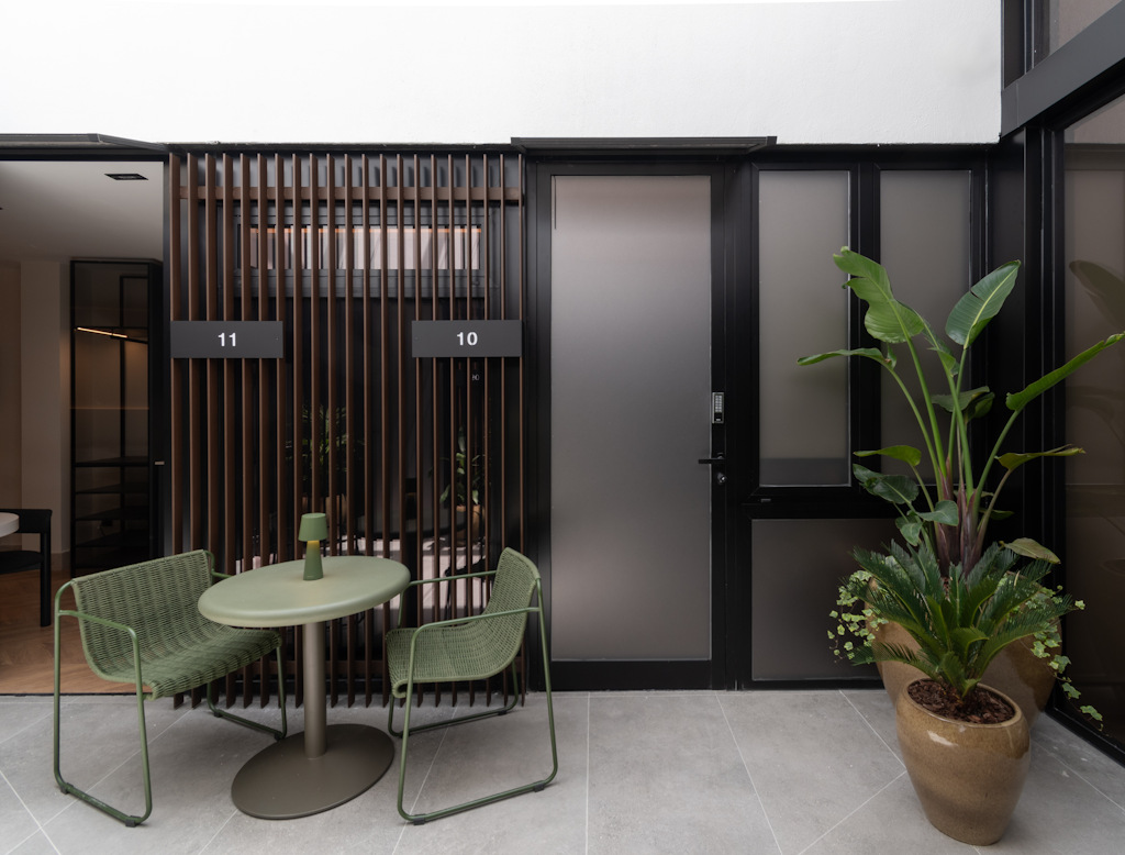 Pacífico Suites offers 21 modern studios built inside a beautifully refurbished industrial warehouse, redesigned to combine comfort, style, and a homely atmosphere. Large exposed trusses run above the corridor connecting the studios, while warm materials, indoor plants, and a bright open courtyard create a welcoming contrast with the warehouse's industrial soul.